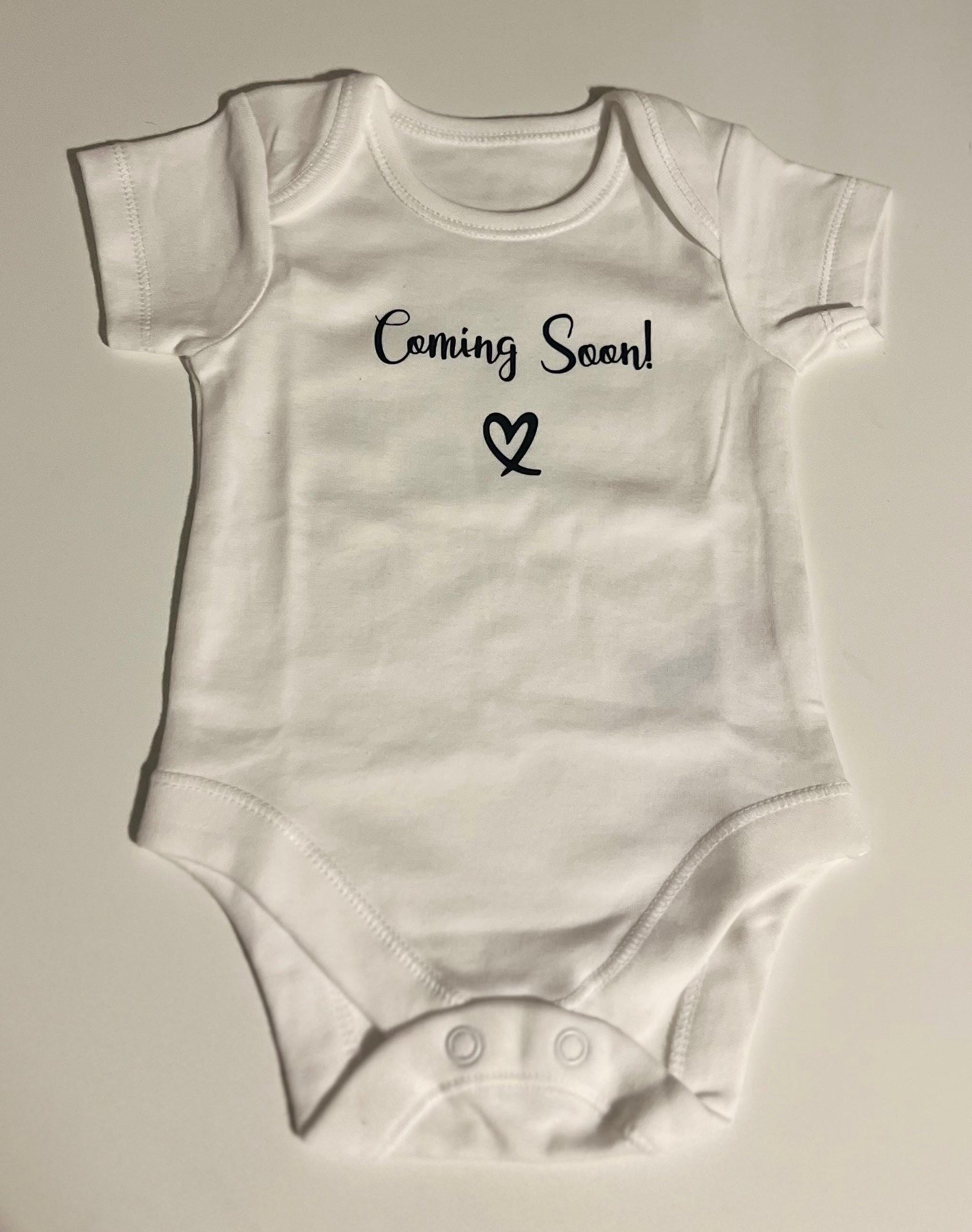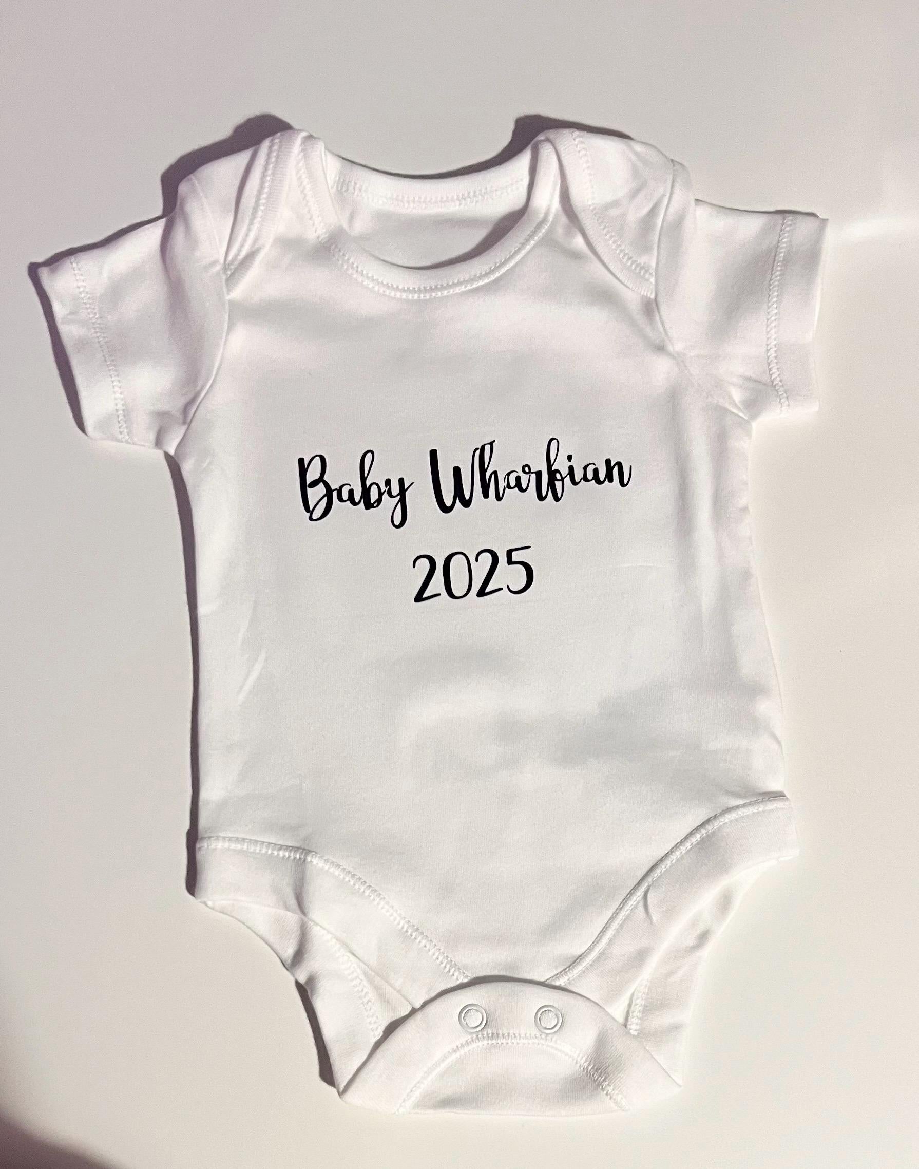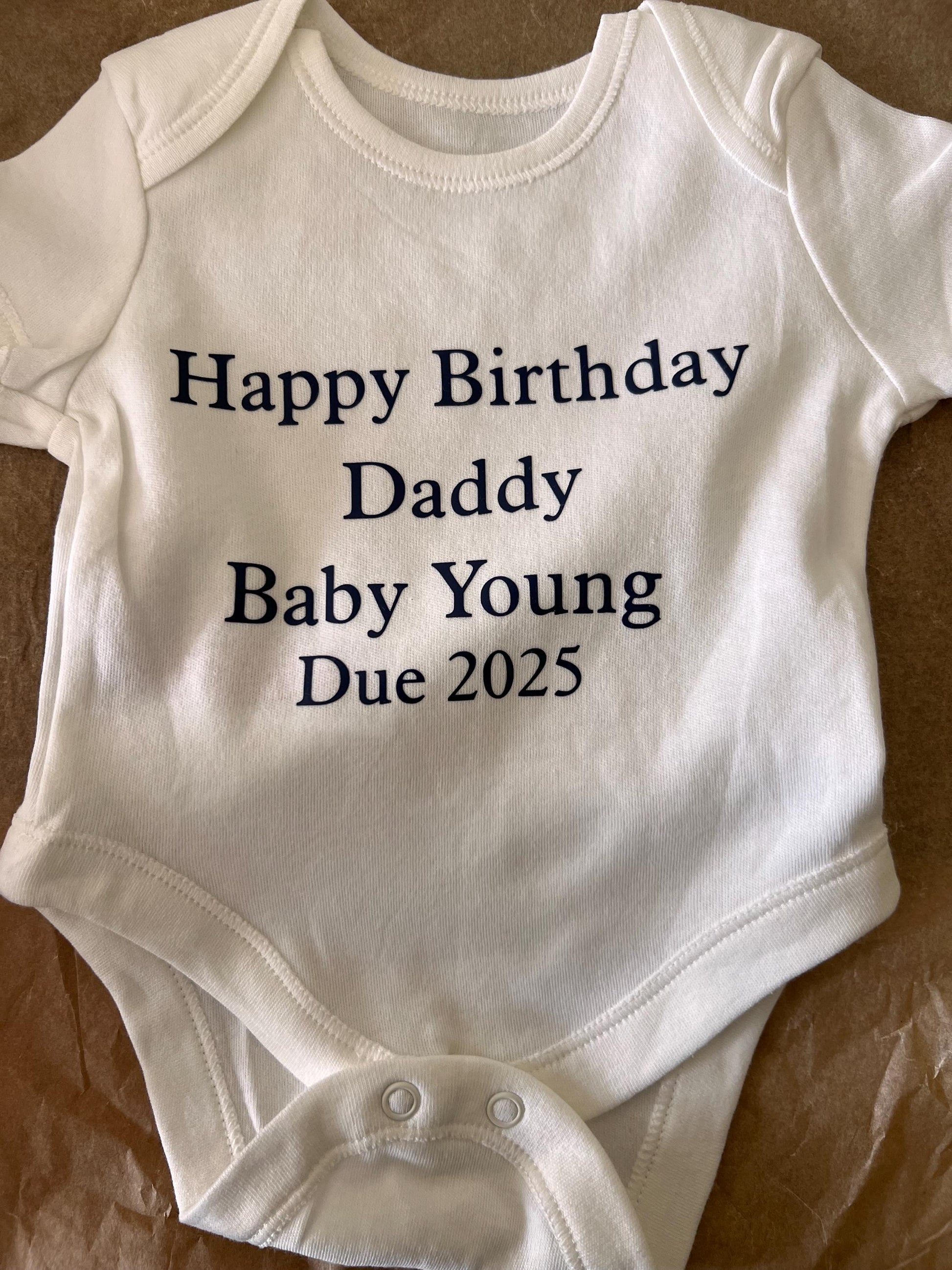Our personalised baby grows can read any wording you’d like, including due date, coming soon, surname etc.