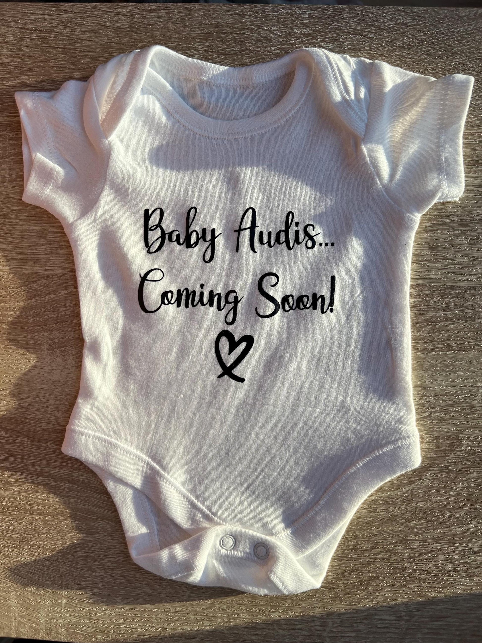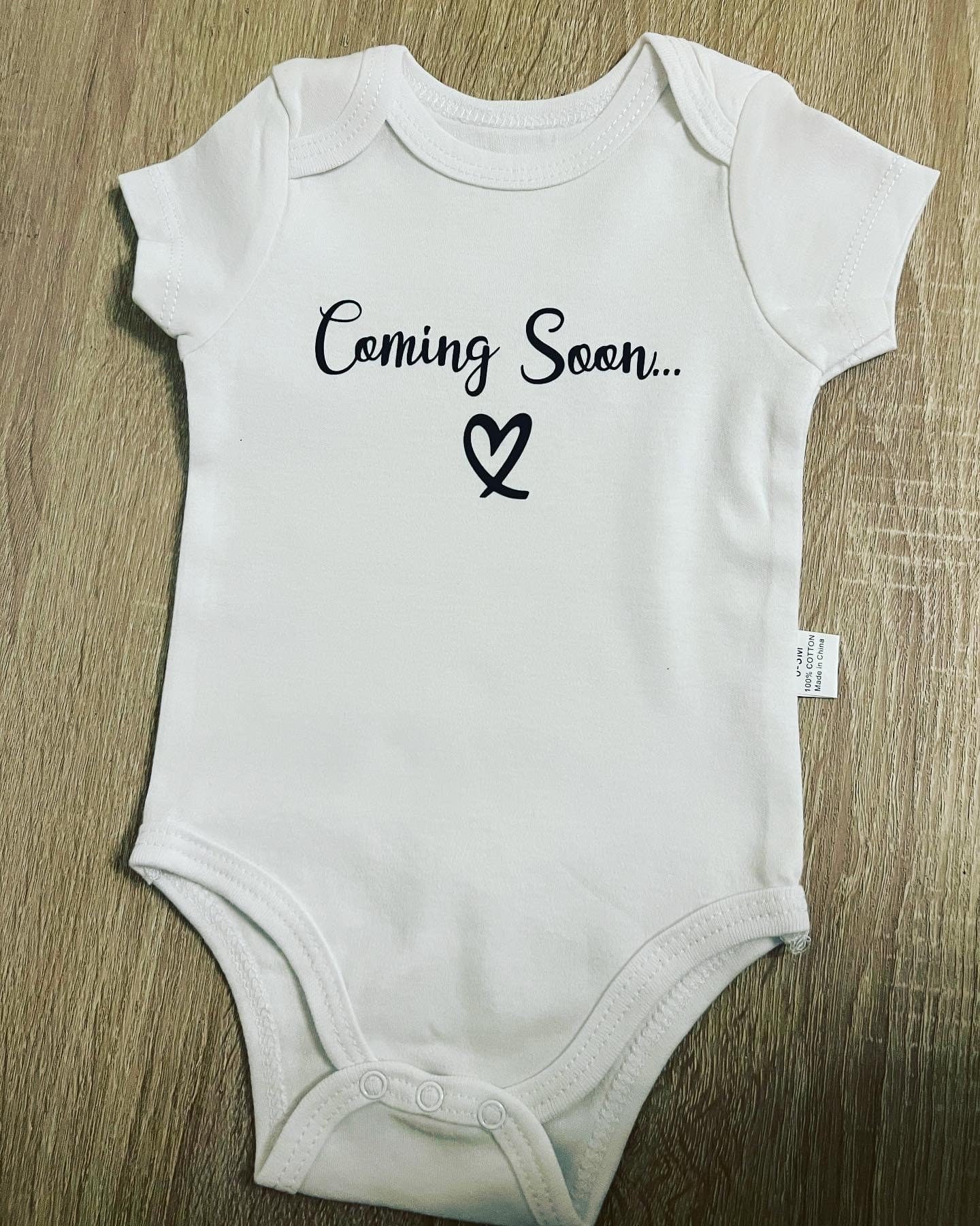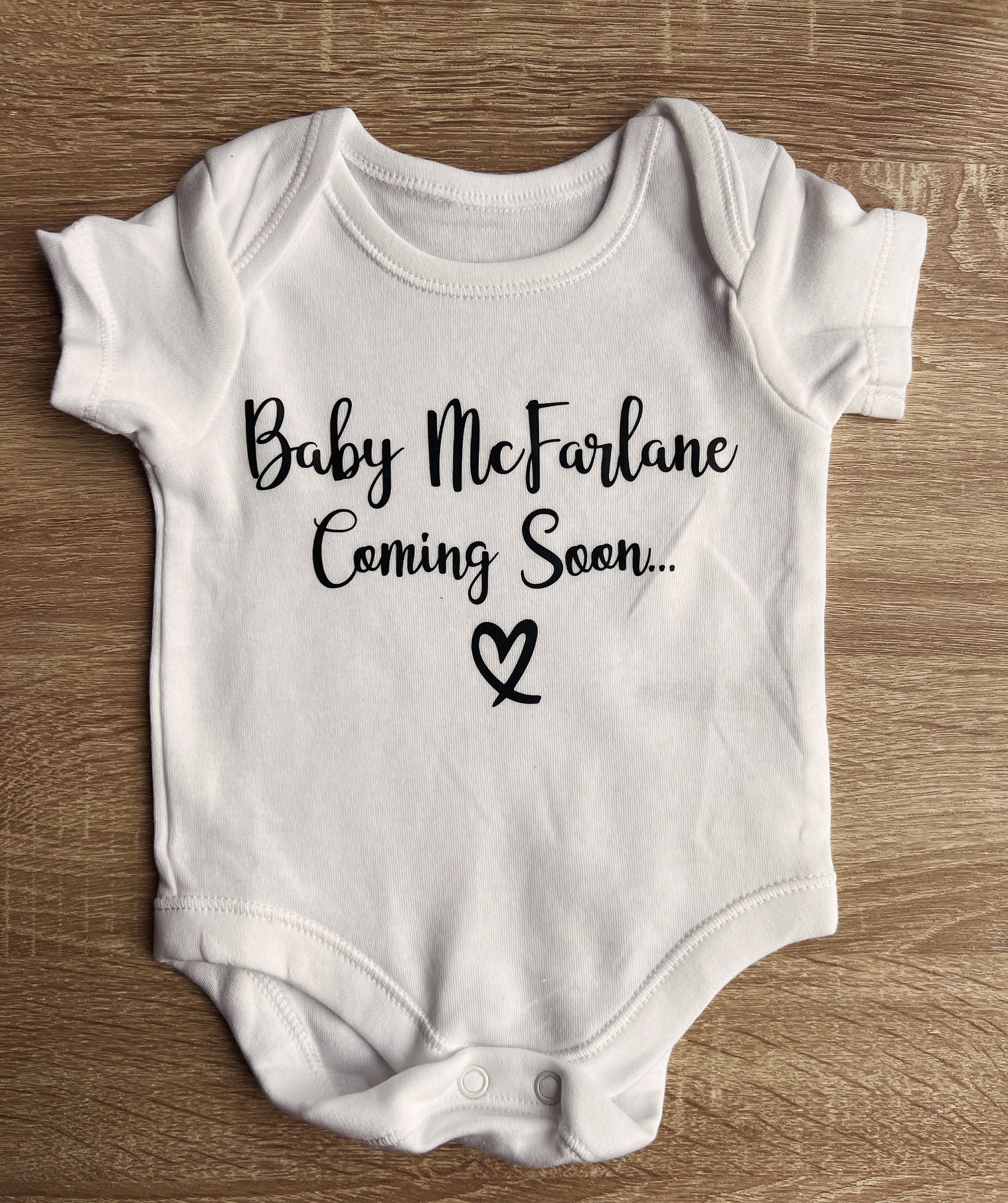 Our personalised baby grows can read any wording you’d like, including due date, coming soon, surname etc.